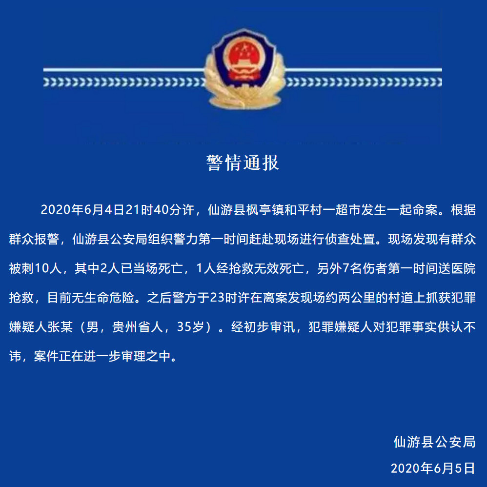 莆田仙游公安局凌晨通报:2020年6月4日21时40分许,仙游县枫亭镇和平村一超市发生一起命案。根据群众报警,仙游县公安局组织警力第一时间赶赴现场进行侦查处置。现场发现有群众被刺10人,其中2人已当场死亡,1人经抢救无效死亡,另外7名伤者第一时间送医院抢救,目前无生命危险。之后警方于23时许在离案发现场约两公里的村道上抓获犯罪嫌疑人张某(男,贵州省人,35岁)。经初步审讯,犯罪嫌疑人对犯罪事实供认不讳,案件正在进一步审理之中。