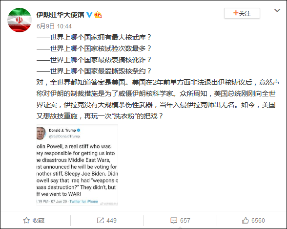 9日上午,伊使馆不甘示弱,连发四问反击:世界上哪个国家拥有最大核武库?哪个国家核试验次数最多?哪个国家最热衷搞核讹诈?哪个国家最爱撕毁核条约?