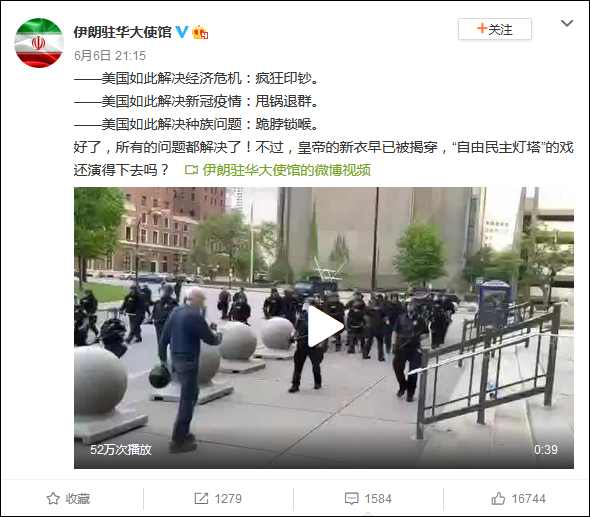 对此,伊使馆的官方微博同样有力反击,最后还不忘加上一段近日纽约州一位75岁抗议老人被警察推倒的视频,讽刺美国“皇帝的新衣”早已被揭穿。