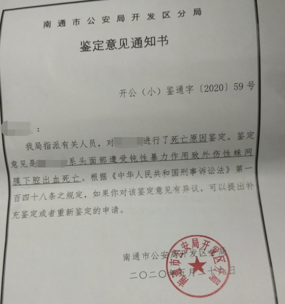 小天母亲出示的死亡鉴定显示,今年15岁的儿子死于“头面部遭受钝性暴力作用致外伤性蛛网膜下腔出血”。