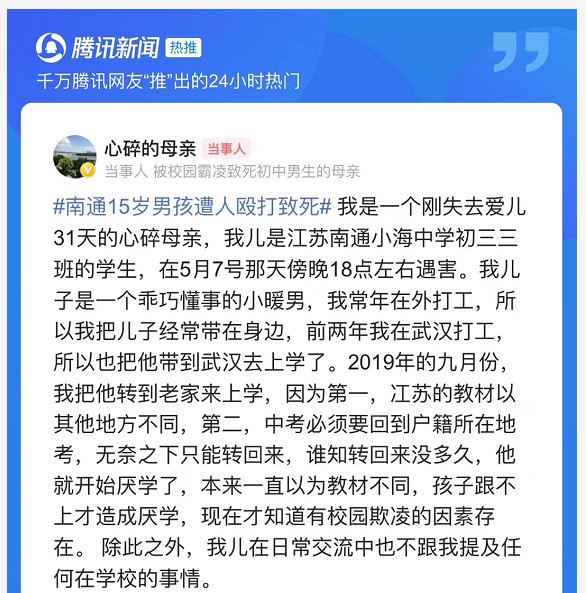 小天与范某就读的南通市小海中学,系1994年由香港实业家方铿捐资兴办。《新民周刊》查阅该学校网站发现,其曾在2018年11月成立了“校园欺凌治理处置领导小组”。本刊记者于6月10日就此事拨通了该小组办公室电话。对方回应称,“警方正在调查,请以警方消息为准,我们不接受采访。”