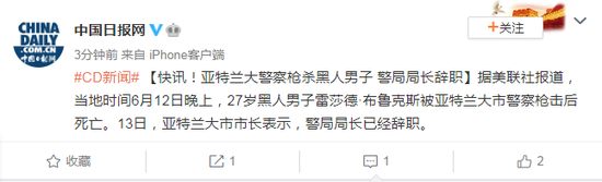 据美联社报道,当地时间6月12日晚上,27岁黑人男子雷莎德·布鲁克斯被亚特兰大市警察枪击后死亡。13日,亚特兰大市市长表示,警局局长已经辞职。