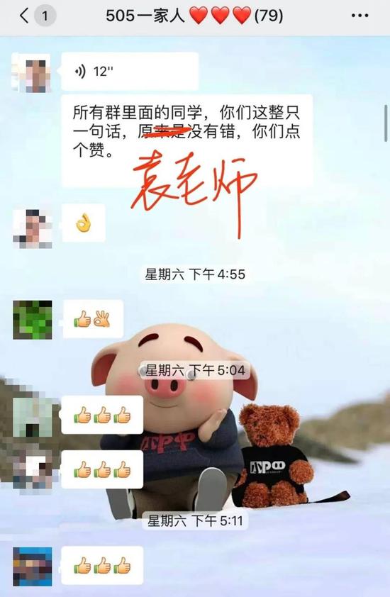 缪缪坠亡两天后的下午4点过,有家长在班级群里发出语音:“袁老师没有错,你们点个赞。”随后有37名家长相继发送表情,竖起了大拇指。据扣子说,在第一个家长点赞后,跟着点赞的家长里,还有一位家长是袁老师的亲戚。