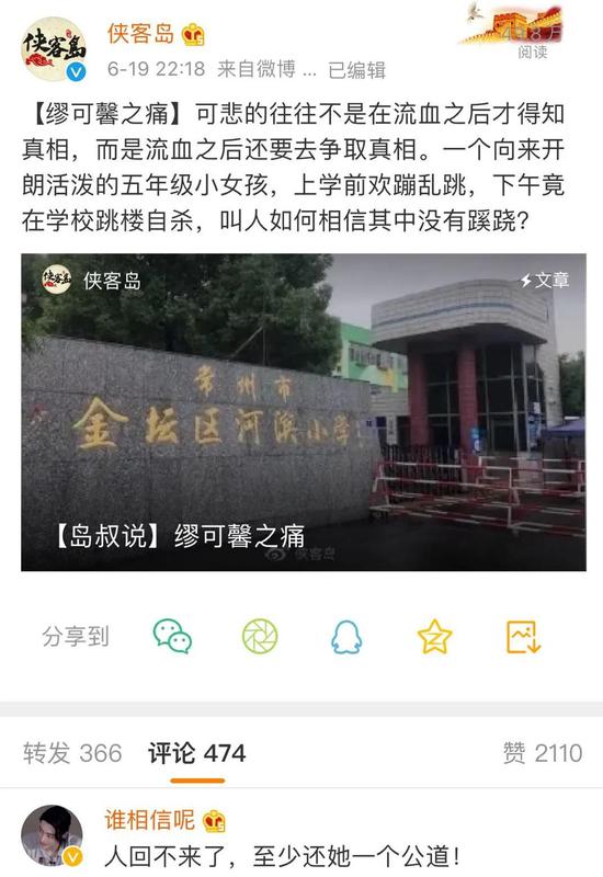 侠客岛对此案发表评论:一个向来开朗活泼的五年级小女孩,上学前活蹦乱跳,下午竟在学校跳楼自杀,叫人如何相信其中没有蹊跷?