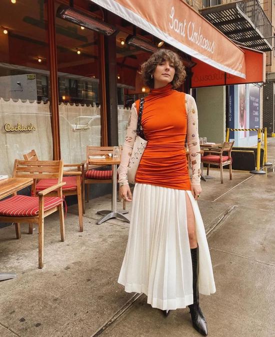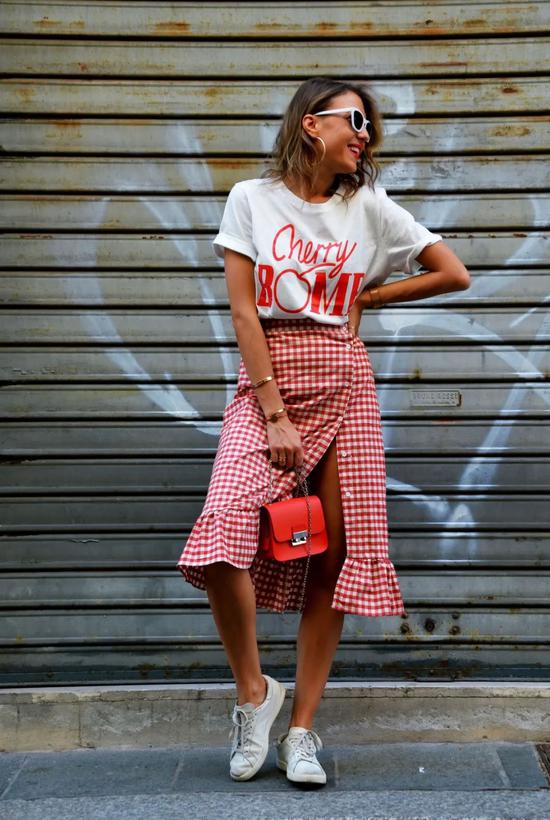 红色T恤已经足够“显眼”,所以不需要更多颜色来让它变得“复杂”,搭配一款浅色的开衩裙正好。