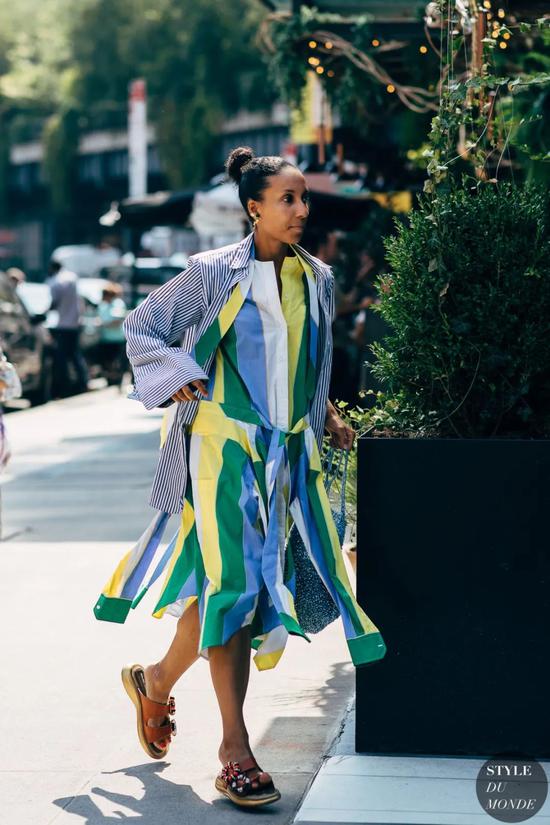 非常显眼的“人鱼姬”色开衩裙,如果用“女人”的单品来搭配,会显得有点Over,但是简单的背心就能中和得刚刚好。
