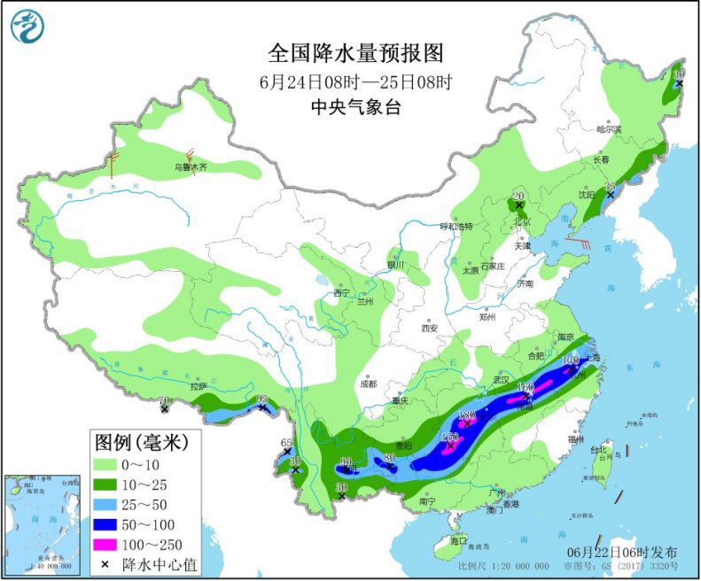 图2 全国降水量预报图(6月22日08时-23日08时) 图片来源:中央气象台