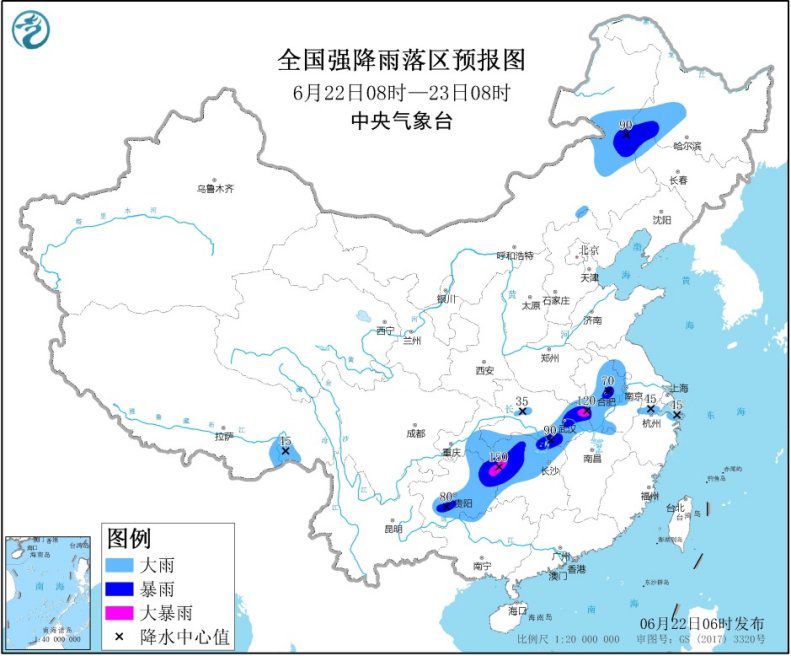 预计,6月22日08时至23日08时,安徽中部和西南部、湖北东部和南部、湖南中北部、重庆东南部、贵州东部和南部、浙江北部及内蒙古东部、黑龙江西南部、吉林西部等地的部分地区有大到暴雨,其中,湖北东北部、湖南西北部等地局地有大暴雨(100~150毫米)。上述部分地区伴有短时强降水(最大小时降雨量30~50毫米,局地可超过60毫米),局地有雷暴大风等强对流天气。中央气象台6月22日06时继续发布暴雨黄色预警(见图1)。