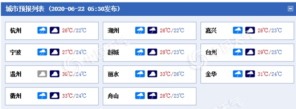 根据浙江省气象台今晨发布的最新预报,今天,浙北地区阴有中到大雨,局部暴雨;其它地区多云到阴有时有阵雨或雷雨,有雷雨地区局部可伴有短时暴雨。