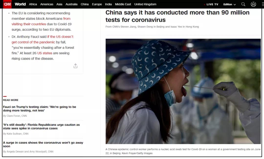 除了北京的新冠病毒核酸检测情况,美国有线电视新闻网还在24日对中国检测情况进行了报道,引用来自中国国家卫健委的说法,中国各地的医疗机构目前已经累计完成了9041万人次检测。
