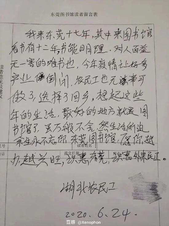 我来东莞十七年,其中来图书馆看书有十二年,书能明理,对人百益无一害的唯书也。今年疫情让好多产业倒闭,农民工也无事可做了,选择了回乡。想起这些年的生活,最好的地方就是图书馆了。虽万般不舍,然生活所迫,余生永不忘你,东莞图书馆。愿你越办越兴旺。识惠东莞,识惠外来农民工。