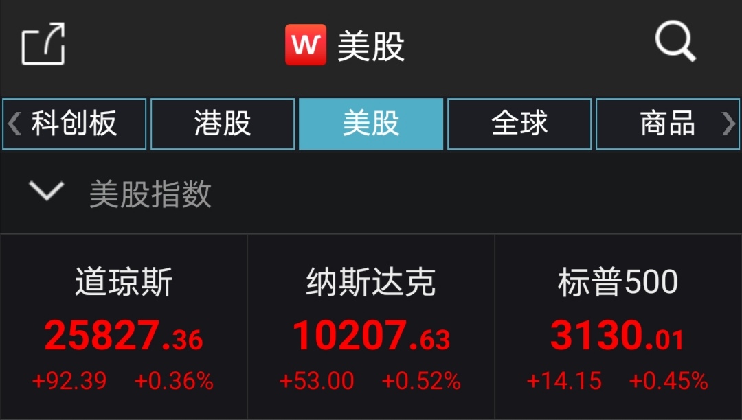 截至收盘,道指上涨92.39点,涨幅0.36%,报25827.36点;纳指涨53.00点,涨幅0.52%,报10207.63点;标普500指数涨14.15点,涨幅0.45%,报3130.01点。