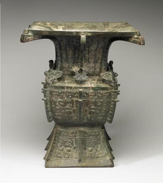 此件是少见的方形尊。方形器物表现了制作者尊贵的身分,装饰也格外华丽。全器布满纹饰,勾勒多变的龙纹和兽面纹。最引人注目的,是器肩每一面皆可见三个形态各异的立体兽头。