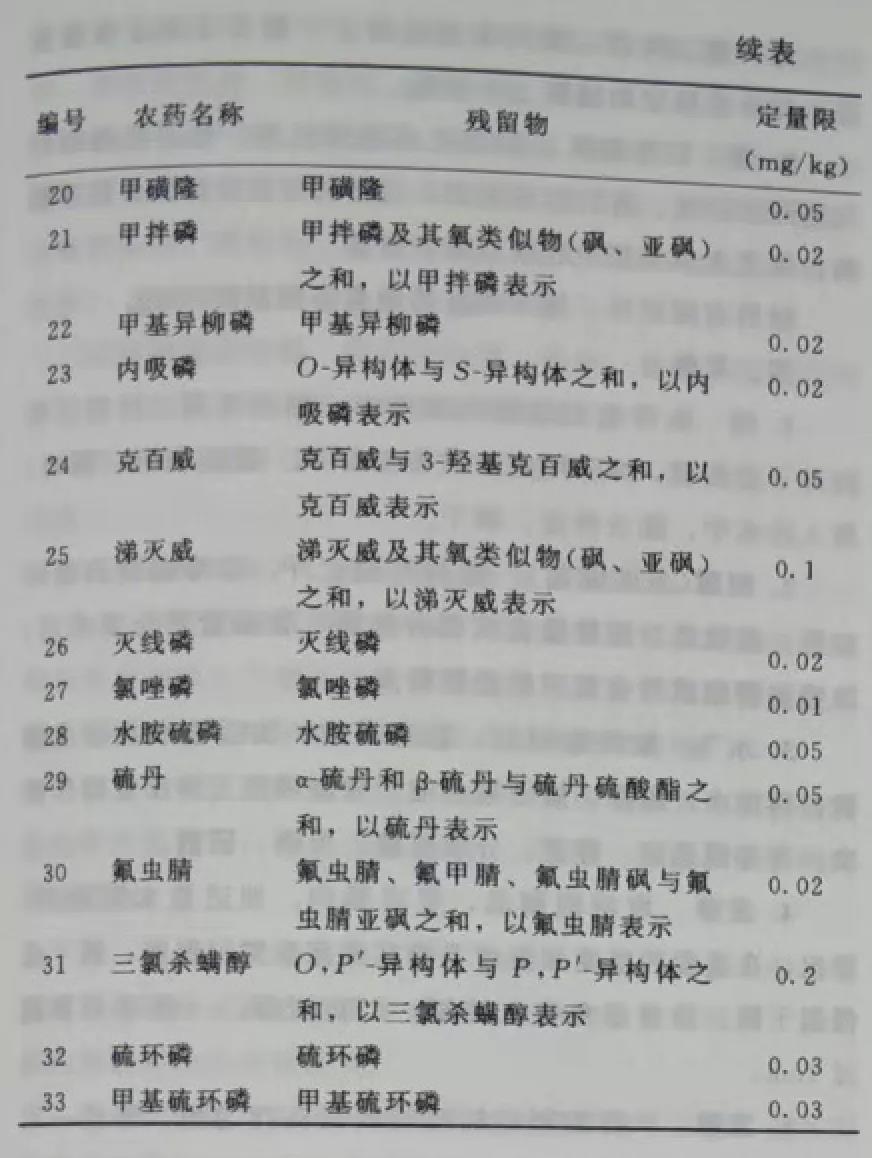 药材及饮片(植物类)禁用农药不得检出(不得过定量限),详见下表: