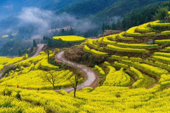 山雾间隐约可见的民居,和炊烟袅袅,仿佛是一副天然水墨画。