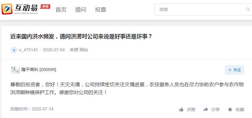 6月以来,南方出现持续强降雨,长江中下游地区发生较重洪涝灾情。本次洪涝灾情对当地上市公司是否产生影响?近日,多家公司通过深交所互动易平台回应投资者密集提问。