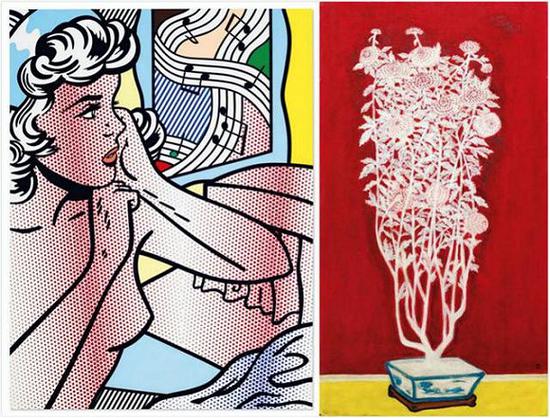 《裸体与欢愉画》(左);常玉《青花盆中盛开的菊花》(右)图片来源:佳士得拍卖官网