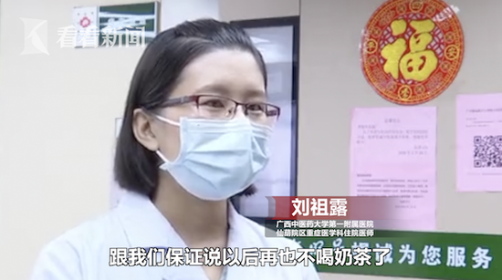 广西中医药大学第一附属医院仙葫院区重症医学科住院医师刘祖露表示:“他昏迷了7天之后终于苏醒了,我们对他进行了葡萄糖耐量试验,明确了他是没有糖尿病的,也就是说他的情况,很可能是喝奶茶引起的,他现在也对奶茶深恶痛绝吧,跟我们保证说,以后再也不喝奶茶了。”