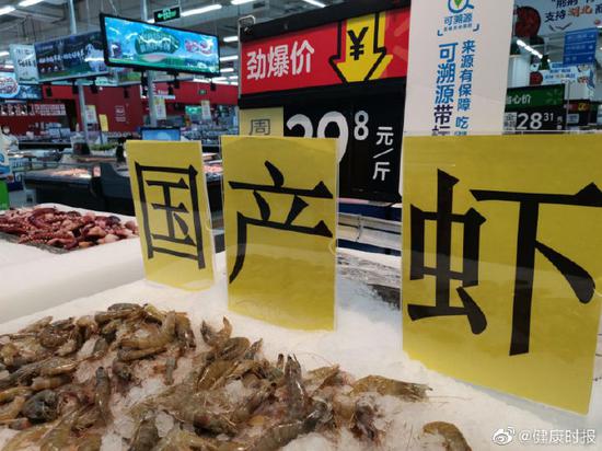 在沃尔玛超市(北京建国路店),在售国产虾的商品导购牌上明确表明“可溯源,安全放心食用”的字。据海鲜区工作人员介绍,近期虾的销量并没有受到疫情太大影响,如有顾客担心虾的食用安全,他们也会去耐心解释。