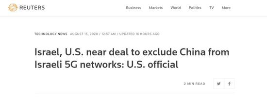 【环球网报道 记者 侯佳欣】据路透社报道,一名美国官员当地时间8月14日透露,以色列和美国即将达成一项协议。根据该协议,以色列将承诺在其下一代5G移动通信网络中不使用中国技术。