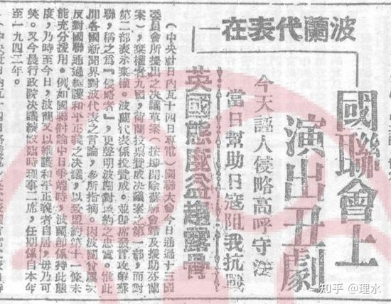 1937年10月3日,国联讨论日本全面侵华问题,波兰代表助桀为虐,不断找各种理由反对中方提案,导致十七页的备忘录仅审理八页。《申报》的报道指出,波兰的核心要求是不得在报告结论中使用“侵略”一词。