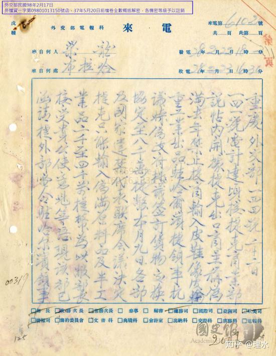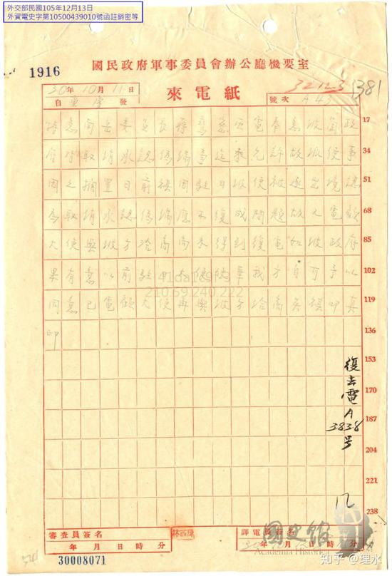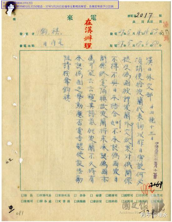 10月11日,驻英公使郭泰祺致电“蒋公”,指出:彼波兰政府对取消承认伪满事,迄未允许,故派使事因之搁置。日前因驻日波使被逐出境,认为取消承认伪满应不复成问题,故又电顾大使与波方洽商,尚未得到复电。如波政府果有意以前驻日大使使华,我方自可予以同意。已电顾大使再与波方洽商矣。