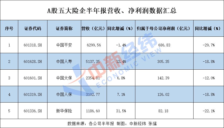 上半年,中国人寿、中国平安、中国太保、新华保险、中国人保归属于母公司股东的净利润合计为1342.77亿元,按天计算日赚7.38亿元,同比下降25.2%。