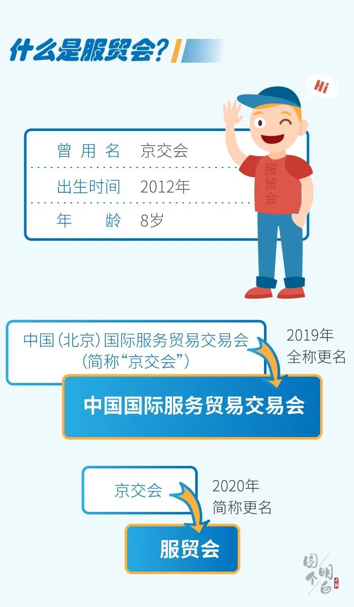 只不过,服贸会改过两次名字。一次是改“大名”,2019年,中国(北京)国际服务贸易交易会(简称“京交会”)更名为中国国际服务贸易交易会;一次是改“小名”,2020年,中国国际服务贸易交易会简称由“京交会”更名为“服贸会”。
