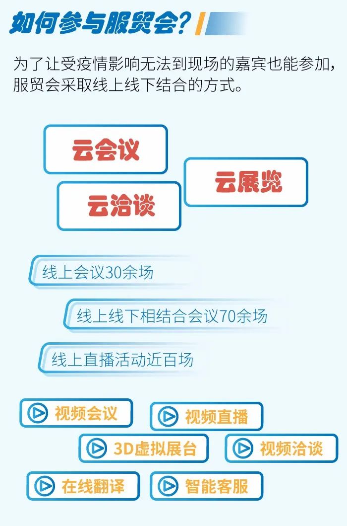 除了线下各种活动,服贸会将举办线上会议30余场,线上线下相结合会议70余场,线上直播活动近百场。视频会议、视频直播、3D虚拟展台、视频洽谈、在线翻译、智能客服等,都为客商和观众们备齐了。