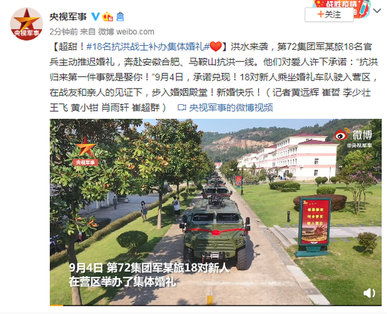洪水来袭,第72集团军某旅18名官兵主动推迟婚礼,奔赴安徽合肥、马鞍山抗洪一线。他们对爱人许下承诺:“抗洪归来第一件事就是娶你!”9月4日,承诺兑现!18对新人乘坐婚礼车队驶入营区,在战友和亲人的见证下,步入婚姻殿堂!新婚快乐!(记者黄远辉 崔哲 李少壮 王飞 黄小钳 肖雨轩 崔超群)