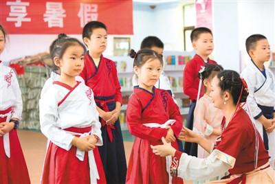 8月10日,在江苏省如皋市少儿图书馆内,老师在教小朋友学习汉服礼仪。