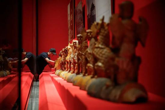 紫禁城里的著名“小兽”,也从屋脊上“搬到”了展厅里。据正楼展厅策展人张杰介绍,“这套小兽是康熙三十四年(1695)重建太和殿时的原件,每件小兽都有美好的象征寓意,尤其是最后一件——行什,只在太和殿出现,是个孤例,也是太和殿建筑无上等级的体现。太和殿初建时名为奉天殿,后多次烧毁。康熙十八年(1679)二月初三日再次焚毁,由于良材难求,取木艰辛,这次工程备料用了十余年;直到康熙三十四年开工,两年后告竣,才有了今日的形制。”
