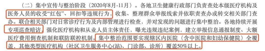 进入到8月份,就正式进入集中宣传与整治阶段。各地卫生健康行政部门负责查处本级医疗机构及医务人员的收受“红包”、回扣等违规行为,收集、整理群众举报线索并依职责查办或转交相关部门查办。