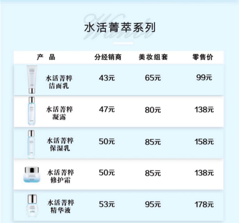 王米田向中新经纬记者展示了产品的价格层级:美妆组套价格、分经销商价格与零售价。美妆组套价格为美妆代理拿货价,而直属代理的拿货价未可知。其中,水活精粹系列五件套的零售价是711元,分经销商的拿货价为243元。