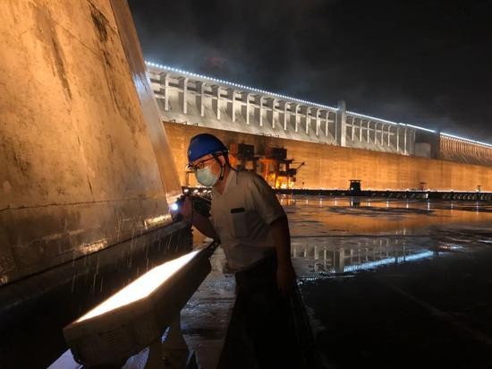 汛期内,长江电力三峡电厂巡检人员检查三峡枢纽建筑物的安全状态。