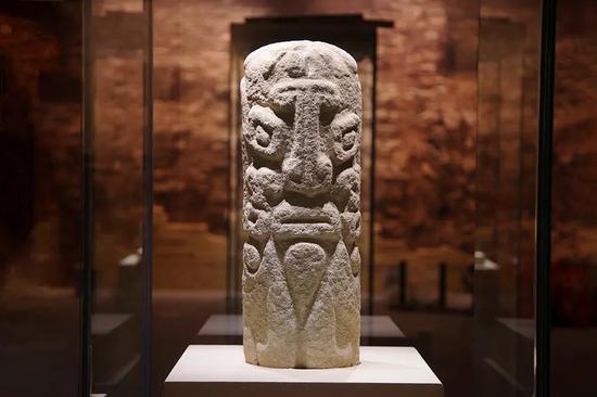 此次展出的石峁遗址文物包括双面人面石雕、蛇纹鬲、口簧、铜刀等。其中双面人面石雕两面各雕一人物,表情生动,艺术风格成熟,与湖北天门后石家河文化中玉人相似,从其形态上看,可能是立于柱头的装饰。