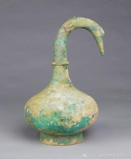 三门峡被誉为“天鹅之城”,每年都有近万只白天鹅自西伯利亚迁徙到当地的黄河湿地过冬。鹅首曲颈青铜壶的出土,为这一美名增添了文化底蕴。 |