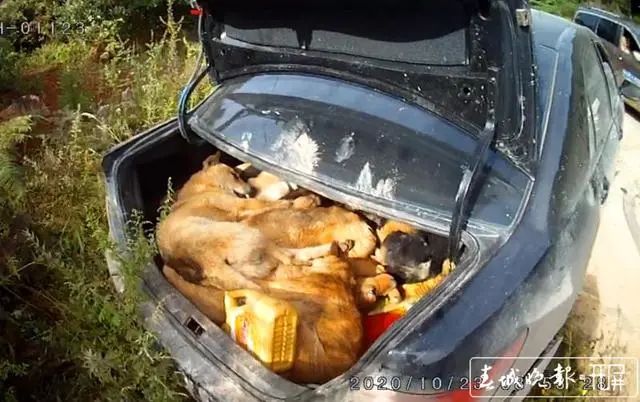让民警难以料到的是,在嫌疑人丢下的车辆后备箱及后座下查获9条被毒死的犬只及作案用的毒饵等物。看着一堆大小不等惨遭毒手的狗狗,现场让人十分难受。