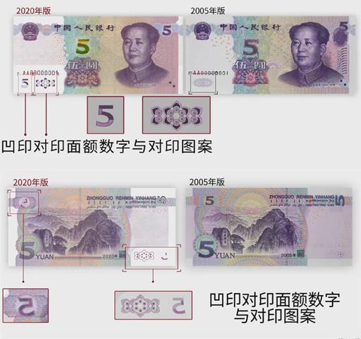 央行工作人员此前介绍,2020年版第五套人民币5元纸币保持2005年版第五套人民币5元纸币规格、主图案、主色调、“中国人民银行”行名、国徽、盲文面额标记、汉语拼音行名、民族文字等要素不变,优化了票面结构层次与效果,提升了整体防伪性能。