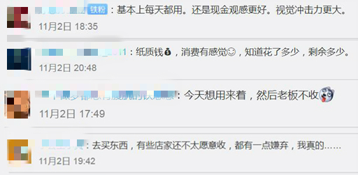 也有网友表示:“基本每天都用,现金观感更好,视觉冲击力更大”“纸质钱,消费有感觉,知道花了多少,剩余多少”。