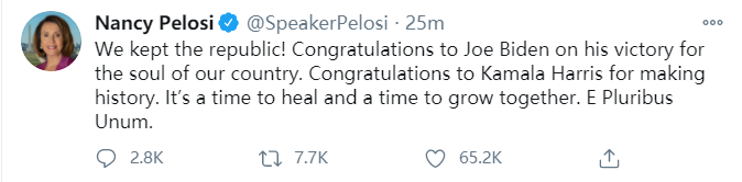 佩洛西表示:“今天标志着美国新的希望日的到来。创纪录的7500万美国人投出选票,选择拜登为美国总统——这是一场历史性的胜利,给予民主党人作出行动的授权。”