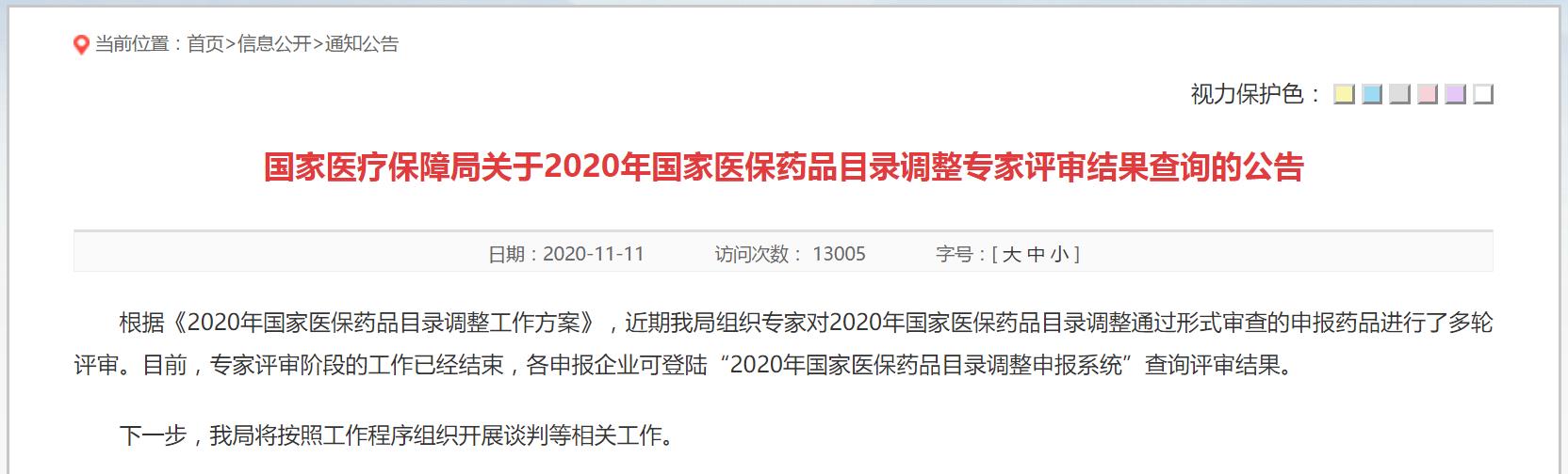 11月11日,国家医保局发布公告称,根据《2020年国家医保药品目录调整工作方案》,近期我局组织专家对2020年国家医保药品目录调整通过形式审查的申报药品进行了多轮评审。目前,专家评审阶段的工作已经结束,各申报企业可登陆“2020年国家医保药品目录调整申报系统”查询评审结果。