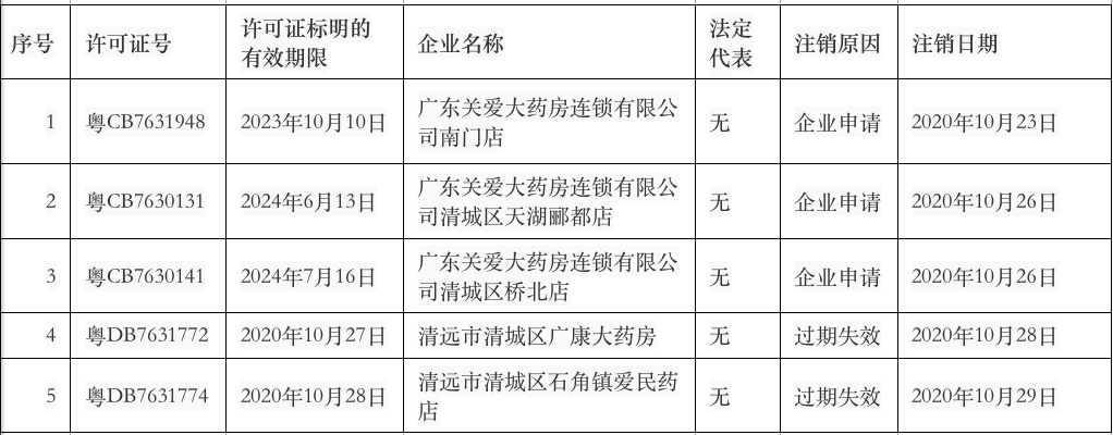 除了上述两家药企因许可证有效期届满没有申请而被注销外,11月10日,广东省药监局也发布了多家药企被注销《药品经营许可证》的公告,其中也有两家因过期没有申请而被注销的。