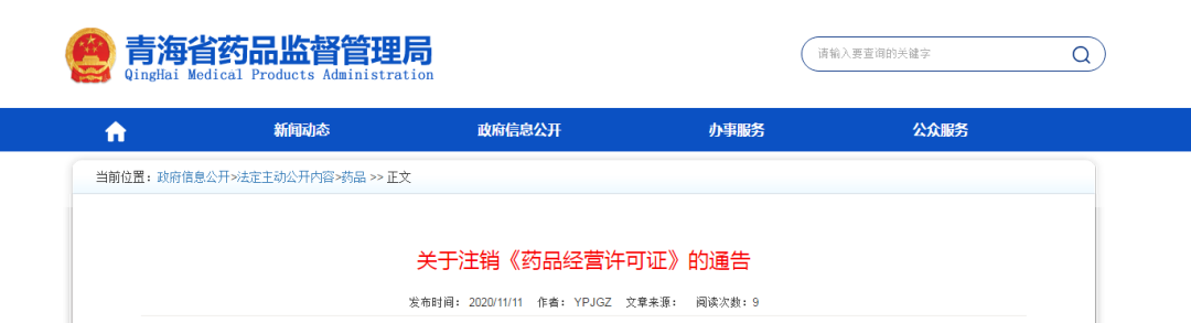 11月11日,青海省药监局发布了一则关于注销《药品经营许可证》的通告。