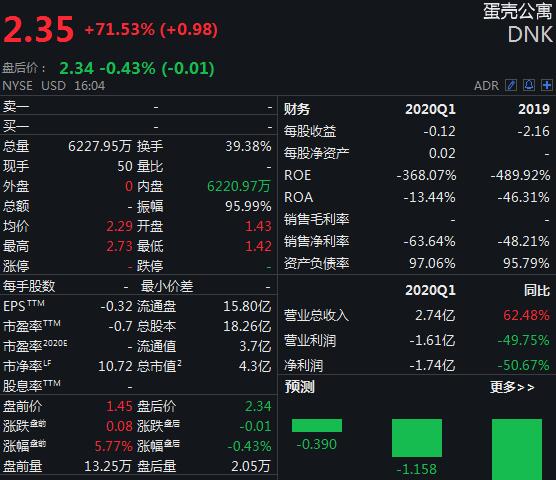 个股方面,蛋壳公寓盘中一度涨超90%,截至美股收盘,涨幅71.53%报2.35美元/股,换手率39.38%,总市值4.3亿美元。