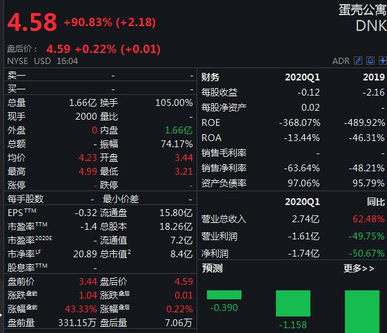 此外,蛋壳公寓盘中一度涨超100%,截至美股收盘,涨幅超90%报4.58美元/股,换手率105%,总市值8.4亿美元。