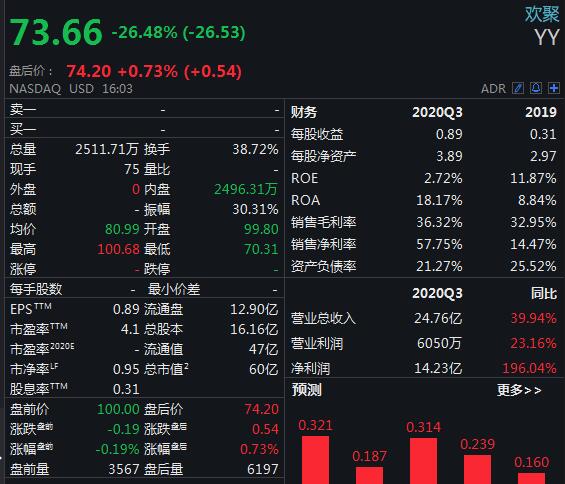 个股方面,欢聚盘中一度跌近30%,截至美股收盘,跌幅26.48%报73.66美元/股,换手率38.72%,总市值60亿美元。