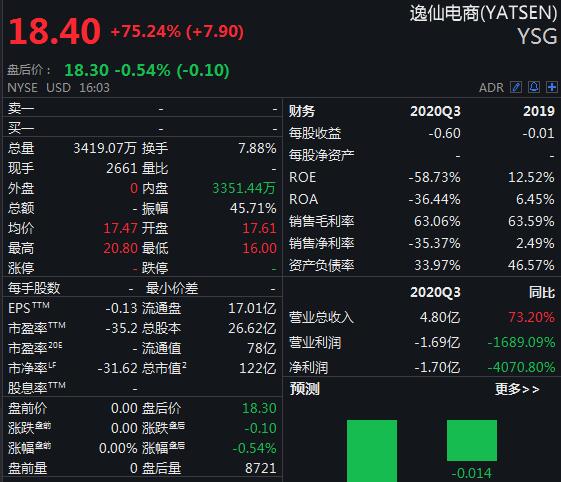 个股方面,完美日记母公司逸仙电商上市首日收涨逾75%,报18.4美元,总市值122亿美元。