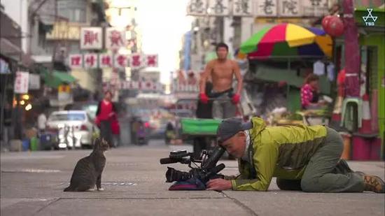 他不用闪光灯,不支三脚架,放低摄像机,俯卧地上,和猫平视。