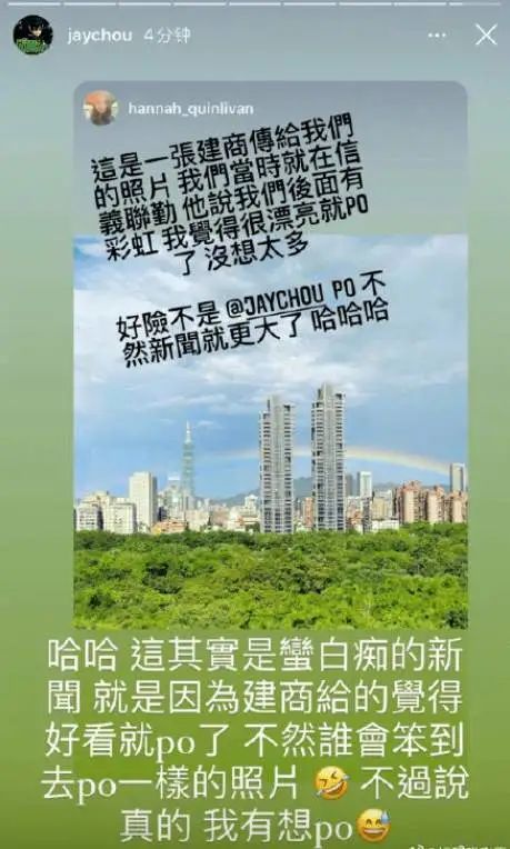 因为昆凌在社交平台发了一张彩虹图,被网友扒出是侯佩岑曾经发过的一张照片。
